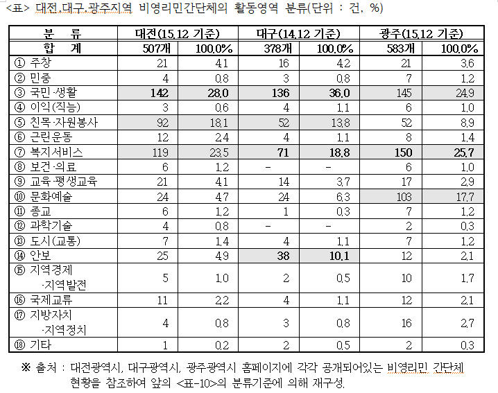대전, 대구, 광주지역 NGO 등록현황을 상호 비교해 보고, 활동차이 역량을 비교분석해 보고자, 해당지역 자치단체 홈페이지에 공개되어있는 비영리민간단체 등록현황 자료를 참조하여 아래 <표>와 같은 재구성하여 분류해 보았다. <표-1>에서의 「비영리민간단체의 분류」는 지방정부에 등록되어있는 비영리민간단체에 대해 ‘단체의 기능’ 및 ‘활동목적(활동방법, 조직의 형태, 주요사업 내용 등)’ 등을 감안하여 총 17개 분야로 분류해본 것으로, 이는 각 지역 NGO의 특성을 이해하는데도 도움이 될 것으로 보인다. 이를 기준으로 대전, 대구, 광주시 등 세 곳에 등록된 비영리민간단체의 활동영역을 분류해보면 아래 <표-1>의 오른쪽과 같이 나타난다.