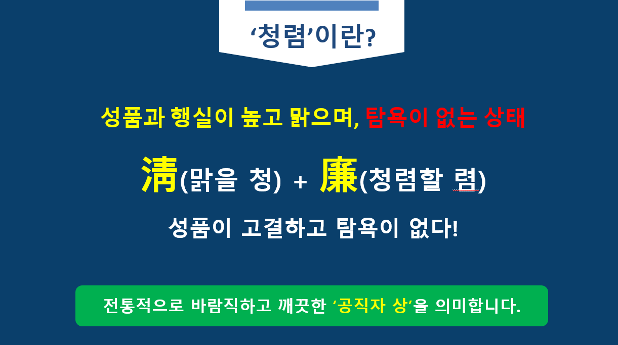 청렴은 개개인의 삶에서 강조되기도 하지만, 사회 전체의 발전에도 중요한 가치 중에 하나입니다. 그래서 청렴은 전통적으로 바람직하고 깨끗한 공직자 상을 의미합니다. 즉 일반인에게 부여하는 가치가 아니라, 주로 공직자에게 부여한 가치란 의미입니다.