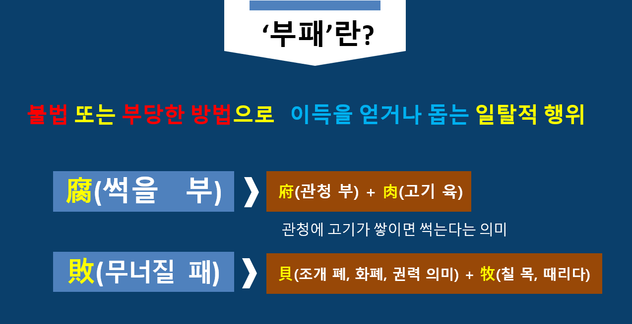 ‘부패(腐敗)’란 불법 또는 부당한 방법으로 이득을 얻거나 돕는 일탈적 행위를 말합니다.