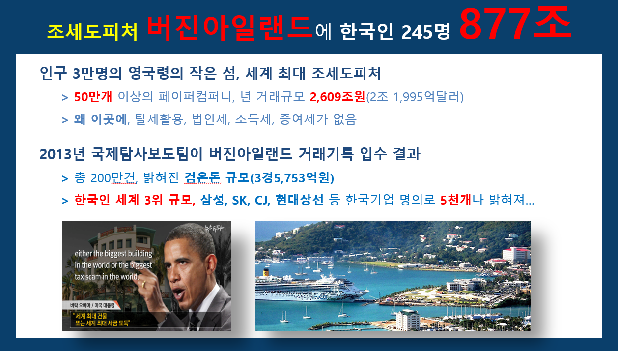 지난 2013년 5월 탐사보도를 전문으로 하는 뉴스타파는 버진아일랜드에 페이퍼컴퍼니를 설립하여 조세피난을 한 245명의 한국인 명단을 공개한 바 있습니다. 놀랍게도 그 규모가 당시 우리나라 국가예산의 두 배에 해당하는 877조나 되었습니다.