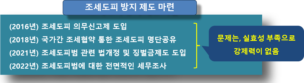 우리 정부는 조세도피처에 대한 규제정책으로 조세도피 의무신고제 도입, 국가 간 조세협약 통한 조세회피 명단공유, 조세도피범 징벌금제도, 조세도피범에 대한 전면적인 세무조사 등을 도입하고 있습니다. 그러나 이러한 정책들은 실효성이 부족하다는 비판이 있습니다.